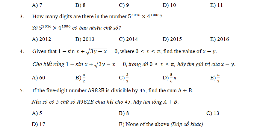 ĐỀ THI TOÁN QUỐC TẾ SINGAPORE VÀ CHÂU Á (SASMO) 2016 - LỚP 2